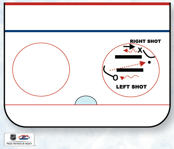 Coaching Points: Start drill with a RIGHT-shot player and LEFT-shot player facing each other behind two dividers. Players should work together and move in opposite direction of each other. In this example, Player O has the puck and moves to his/her left (their forehand side). Player X moves to his/her left (their backhand side). Player X gives Player O a good target. Player O passes the puck to Player X. Player X corrals puck on backhand, and in one motion, moves to the right while moving the puck across his/her body. Drill continues as player X reports to the right side of his/her divider to deliver a forehand pass to Player O on his/her backhand at the right side of his/her divider. Repeat as many times as desired.